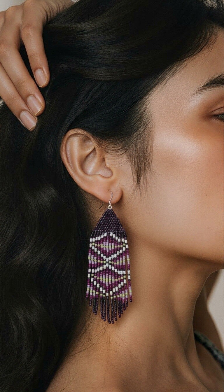 Boucle d`oreille tissée selon la technique de tissage à l'aiguille qui permet de créer des motifs en perles sans nécessiter de métier à tisser. Les perles utlisées sont de minuscule perle de verre.
